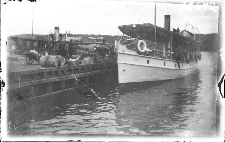 Jos minulla olisi ollut enemmän aikaa viipyä Kuopiossa, olisin odottanut vakavampaa matkasäätä, vaan nyt täytyi tyytyä tähän. Kello 3 menin laivarantaan ja etsein "Tähteä", niinkuin ne kolme kuningasta itäiseltä maalta. Kävin edes takasin satamalaiturin reunaa ja tarkastelin lähteviä laivoja, joilla kaikilla oli oma saattoväkensä. Mutta siellä oli vaan "Kainoja", "Neitiä", "Lempiä", "Sukkelia" ... ahaa, tuolla pilkistää "Tähti" toisen takaa.