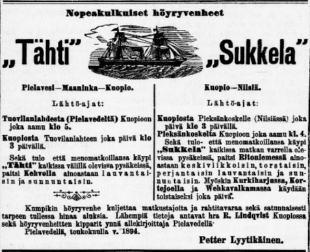 Muuan tukevan näköinen, jyrkkäpuheinen Pielaveden isäntä selitti syyksi, että nyt oli saavuttu Maaningan pitäjän rajoihin, ja maaninkalaiset kuuluivat niin riitautunneen kunnallisissa asioissaan, että korkeintaan kolme henkeä sopii samaan laituriin; ja vaikka laitureita on niin tiheässä, täytyy paraita pukareita viedä veneellä laivaan keskiselälle saakka. Sellaista se tuntui sielläpäin olevan kunnallisen itsehallinnon vaikutus laivaliikkeeseen.