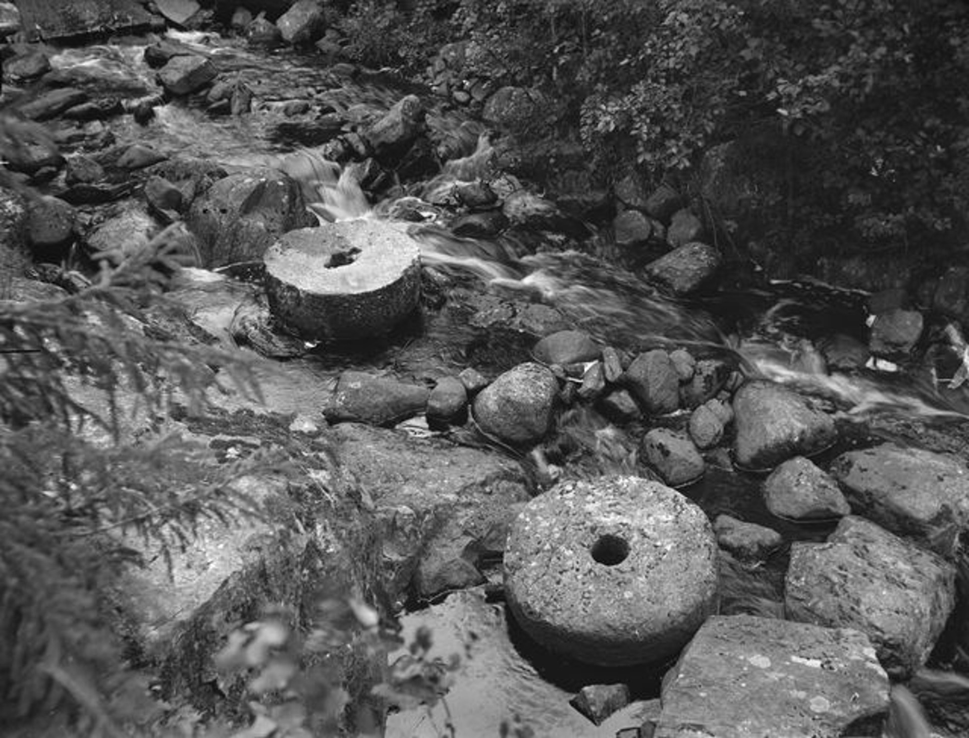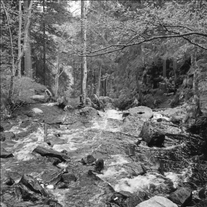 Ja nyt sitä sitte ollaan Korkeallakoskella. Suurella vauhdilla syöksyy vesi kallion kielekkeeltä alas kivikkorinnettä synkkään syvyyteen. On aikoinaan särkenyt myllynkin niskastaan, koska pari myllynkiveä ja joukko seinähirsiä törröttää paraassa nielussa.
