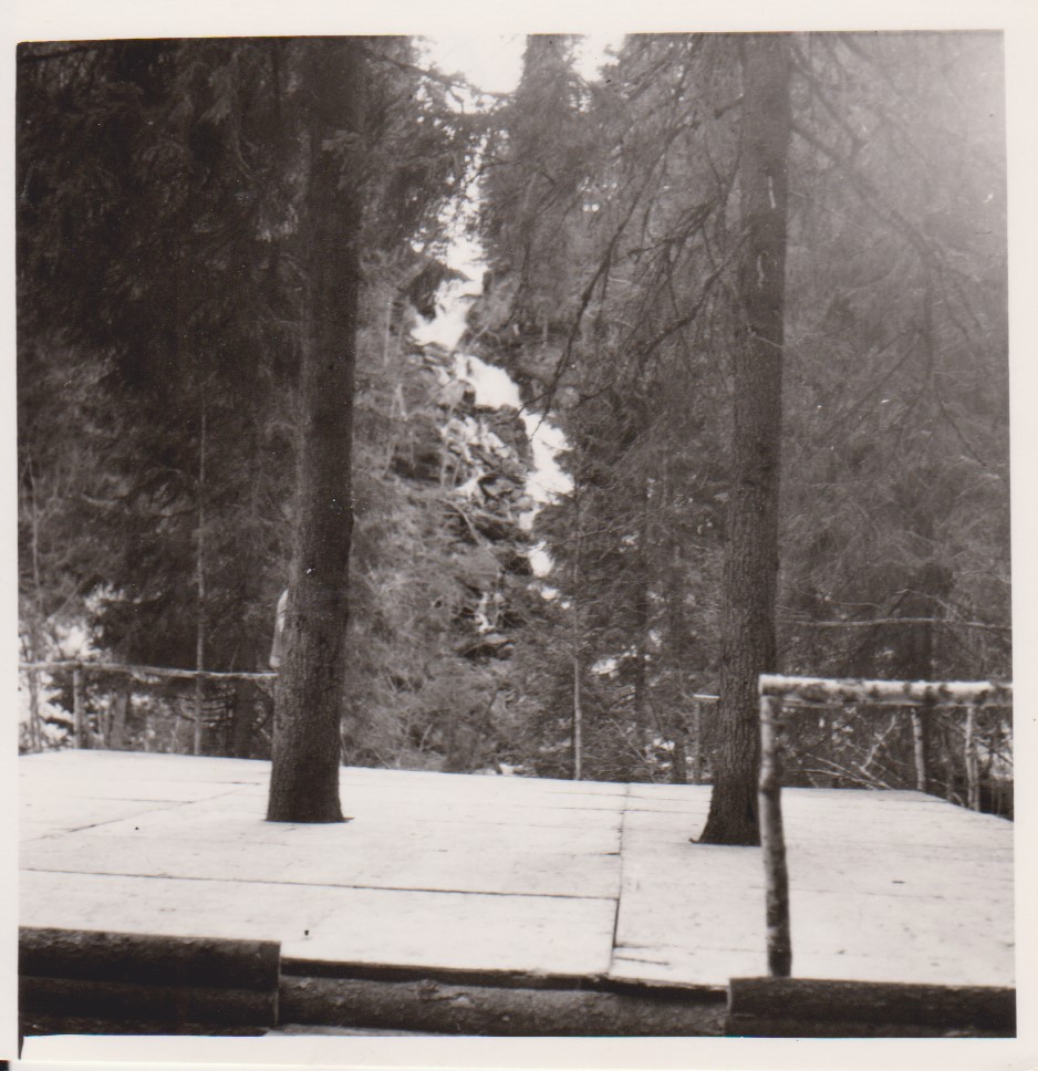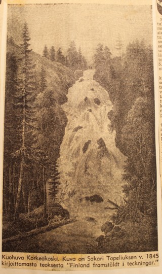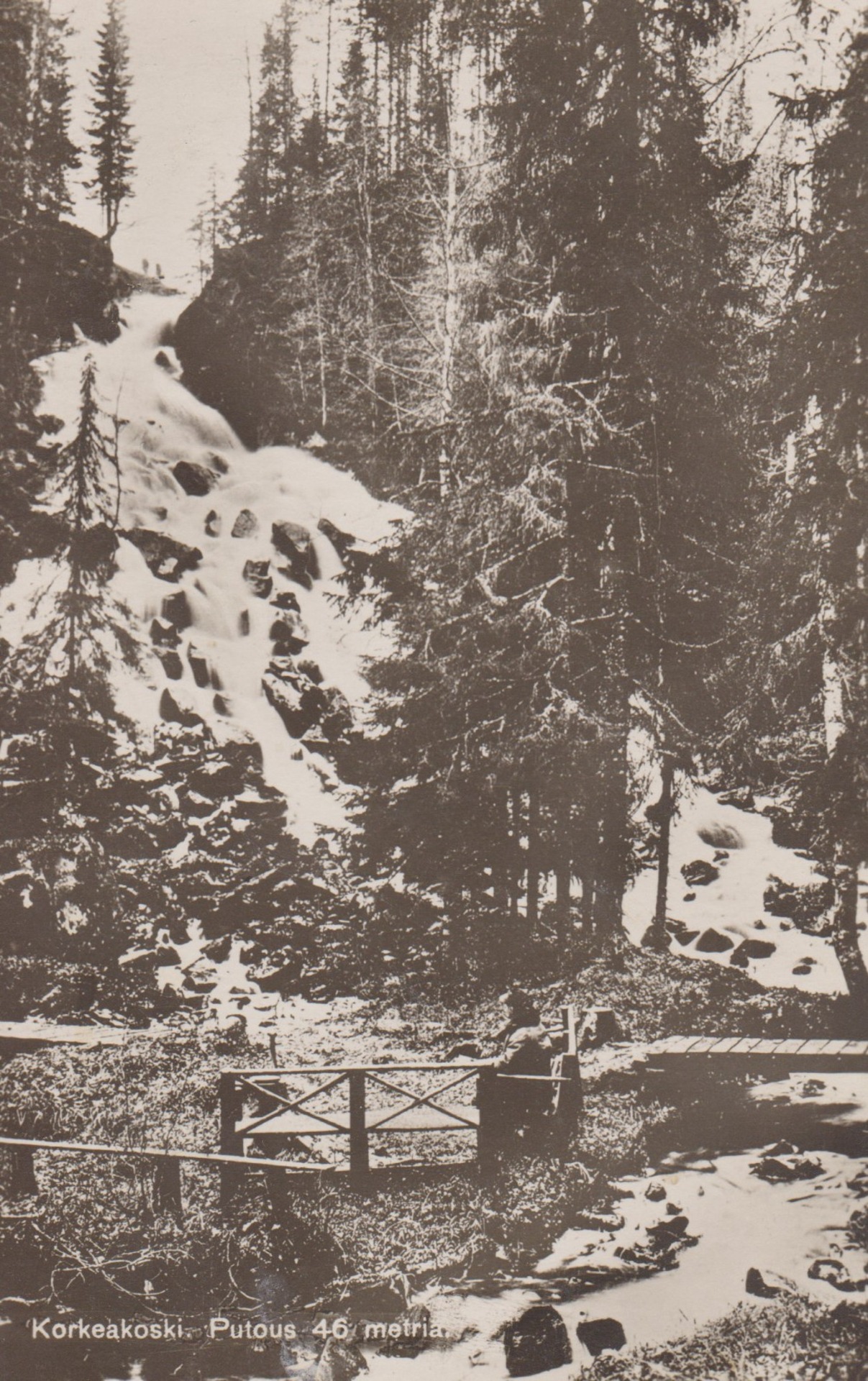 Onhan siinä vilskettä: vesi valkeana vaahtona, ja hieno huuru kohoaa kohden korkeutta. Astumme siinä portaita myöten kosken alle, toivoen joka askeleella, että Matkailijayhdistys jo olisi tehnyt aikomansa paremmat portaat. Raskas pielaveteläinen sitä varsinkin toivoi, sillä hän sanoi pelkäävänsä kuolemaa, kun oli huonoissa väleissä papiston kanssa kunnanesimiehen vaalin takia.
