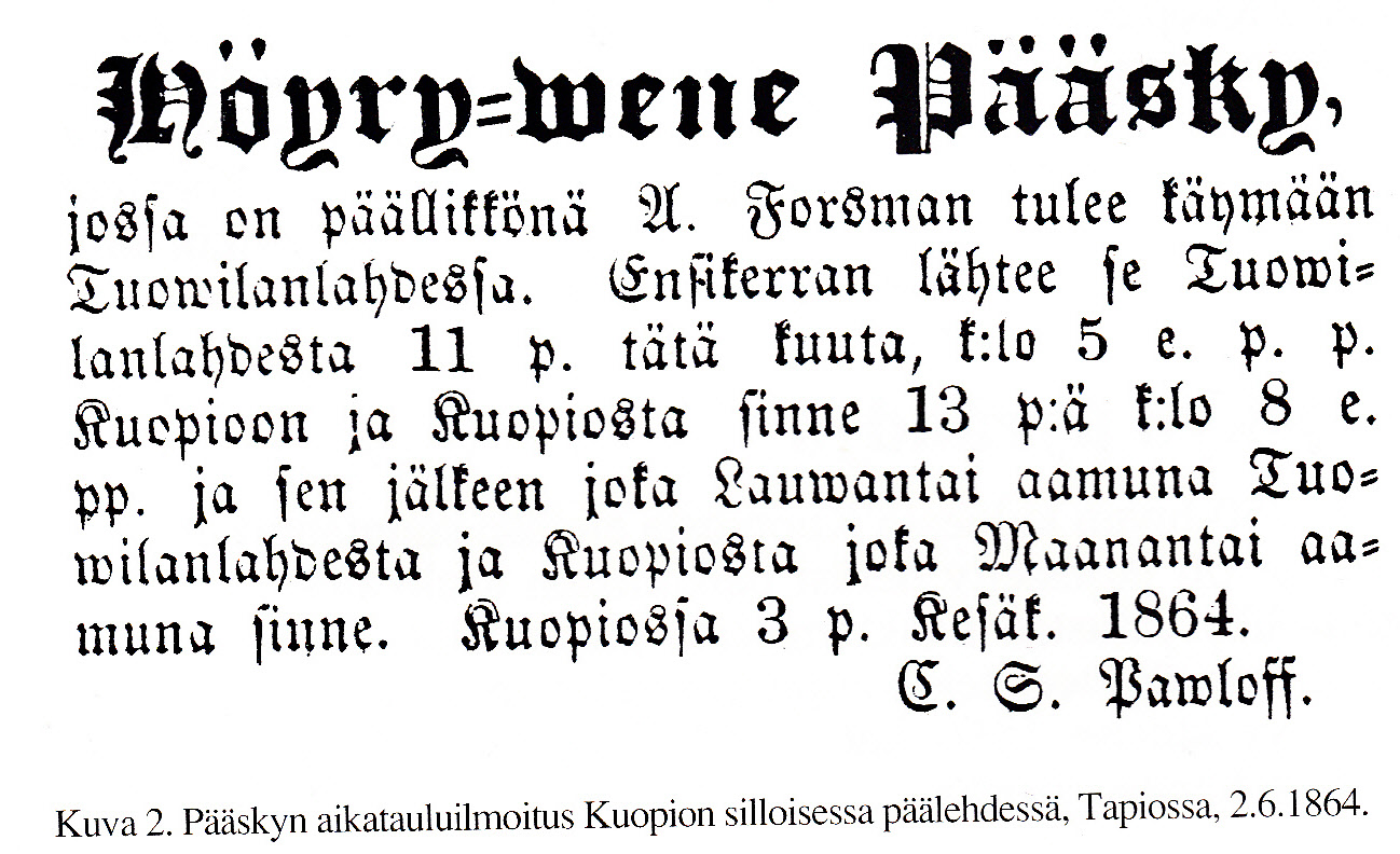 erehdykset. Oli kaunis heinäkuun 18 päivä 1864 (ei 1862). Tuovilanlahden Savolassa
